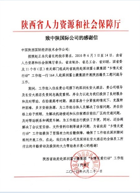 2010年6月5日至6月14日,陜西省有關(guān)部門組成的省政府赴深圳富士康“鄉(xiāng)情關(guān)愛行動”工作組一行164人在深圳富士康集團(tuán)開展陜西籍員工慰問疏導(dǎo)工作,并入住我集團(tuán)所屬深圳長安大酒店。在此期間,深圳長安大酒店的領(lǐng)導(dǎo)高度重視,和酒店全體員工全力以赴,克服困難,認(rèn)真做好接待服務(wù)工作,為工作組在深圳的工作提供最優(yōu)質(zhì)服務(wù)和幫助,得到了工作組的高度贊揚(yáng)。工作組回到西安后,特別致函我公司表示衷心感謝。