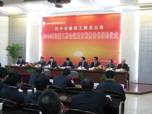 2010年3月21日,漢中市建筑工程總公司組織召開(kāi)了2010年經(jīng)營(yíng)工作會(huì)議暨目標(biāo)責(zé)任書(shū)簽約儀式,參加會(huì)議的有漢建總領(lǐng)導(dǎo)、中層干部、各項(xiàng)目部項(xiàng)目經(jīng)理及技術(shù)管理骨干。陜西省外經(jīng)貿(mào)實(shí)業(yè)集團(tuán)董事長(zhǎng)劉耀華、集團(tuán)副總經(jīng)理李鳳成、總會(huì)計(jì)師劉晏及集團(tuán)公司辦公室、經(jīng)營(yíng)管理部、財(cái)務(wù)部、黨群部等各部門(mén)領(lǐng)導(dǎo)出席會(huì)議。