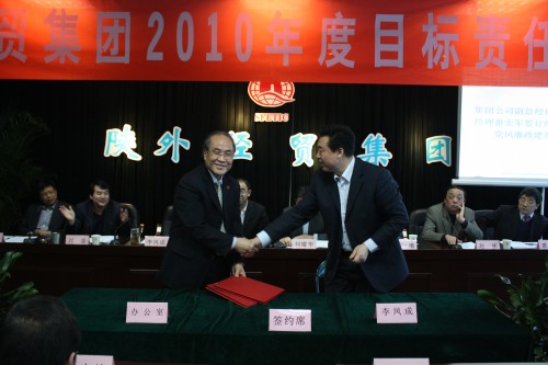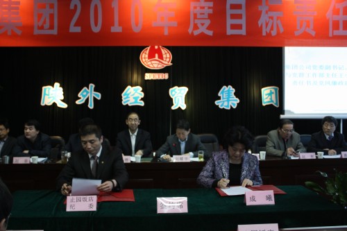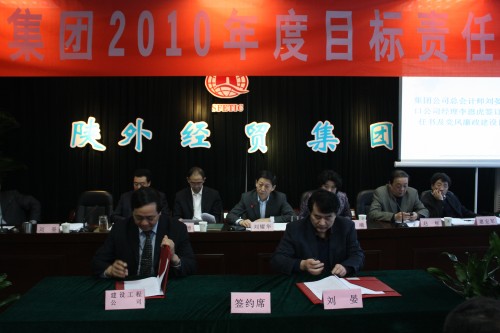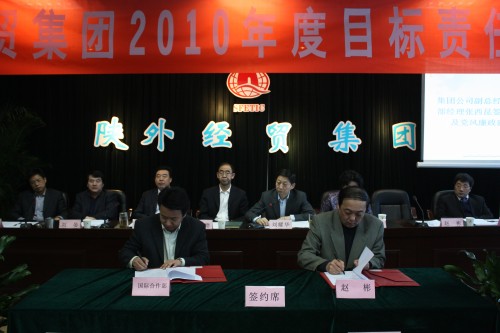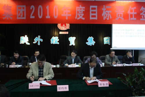 2010年2月26日,省外經(jīng)貿(mào)集團(tuán)2010年度目標(biāo)責(zé)任書簽約大會在集團(tuán)5樓會議室召開。集團(tuán)公司32個經(jīng)營單位、機(jī)關(guān)職能部門負(fù)責(zé)人與分管領(lǐng)導(dǎo)簽訂了經(jīng)營、管理、黨風(fēng)廉政目標(biāo)責(zé)任書。由此,使集團(tuán)公司2010年完成銷售收入20.166億元、實(shí)現(xiàn)利稅8000萬元(利潤800萬元)的預(yù)期目標(biāo)任務(wù)得到了分解落實(shí),為全面完成“十一五”規(guī)劃目標(biāo)和省國資委下達(dá)的年度考核目標(biāo)奠定了基礎(chǔ)。集團(tuán)公司黨委書記、董事長劉耀華主持會議并做了重要講話。他強(qiáng)調(diào)指出:今年經(jīng)營管理目標(biāo)已確定,要求各單位、部門按所簽訂的責(zé)任書內(nèi)容,拿出具體落實(shí)辦法,細(xì)化目標(biāo)責(zé)任指標(biāo),將各項(xiàng)工作落到實(shí)處;要加快經(jīng)營發(fā)展方式轉(zhuǎn)變,自加壓力、奮力拼搏,力爭圓滿完成各項(xiàng)目標(biāo)任務(wù),推動經(jīng)營、管理、黨的建設(shè)等各方面工作再上新臺階、再創(chuàng)新水平。