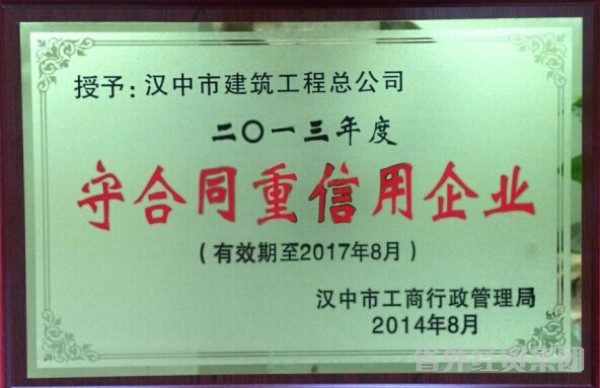 近日,從漢中市工商行政管理局獲悉,漢建總再次被評(píng)為漢中市“守合同重信用”企業(yè)。