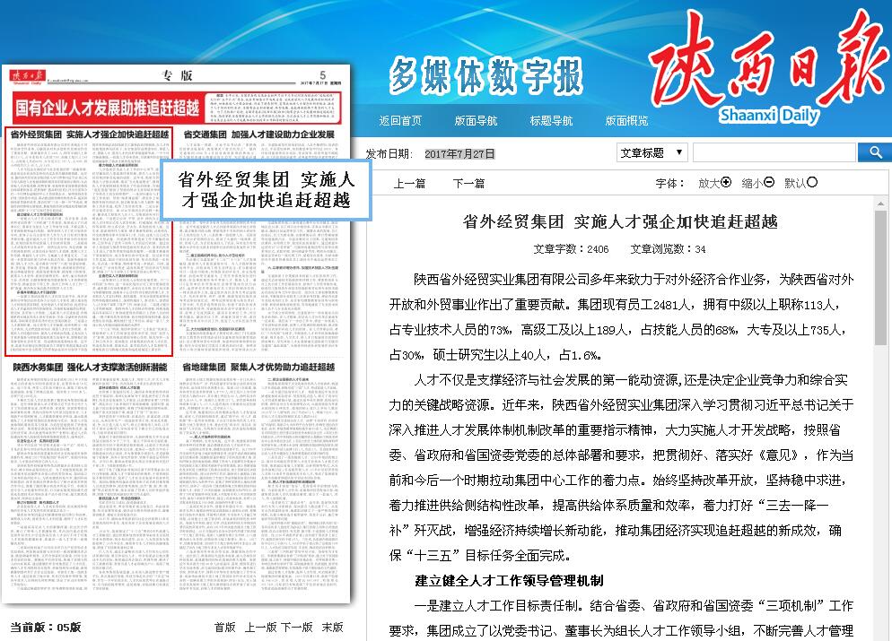 7月27日集團(tuán)公司黨委書記肖玉龍同志在《陜西日?qǐng)?bào)》第五版發(fā)表了題為《省外經(jīng)貿(mào)集團(tuán) 實(shí)施人才強(qiáng)企加快追趕超越》的文章,提出了集團(tuán)公司深化人才發(fā)展體制機(jī)制改革的總體思路和工作要求,思想性、指導(dǎo)性、針對(duì)性都很強(qiáng),對(duì)加快實(shí)施人才強(qiáng)企戰(zhàn)略,深入推進(jìn)人才發(fā)展體制機(jī)制改革,推動(dòng)集團(tuán)公司實(shí)現(xiàn)創(chuàng)新驅(qū)動(dòng)和轉(zhuǎn)型發(fā)展具有重要的指導(dǎo)意義。請(qǐng)集團(tuán)公司各黨組織及時(shí)組織學(xué)習(xí),認(rèn)真貫徹落實(shí),加快形成有利于人才創(chuàng)新創(chuàng)業(yè)的制度環(huán)境,為實(shí)現(xiàn)追趕超越目標(biāo)提供有力支撐。