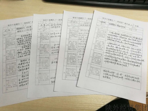 陜外經(jīng)貿(mào)集團(tuán)紀(jì)委于近日開展2017年領(lǐng)導(dǎo)干部“一崗雙責(zé)”履職填報工作,集團(tuán)中層副職以上領(lǐng)導(dǎo)結(jié)合自身工作實(shí)際,對照年初制定的目標(biāo)責(zé)任分解認(rèn)真進(jìn)行填報,共收到35份填報表。