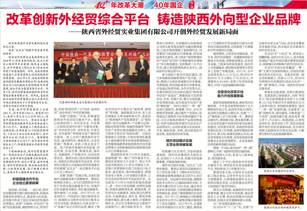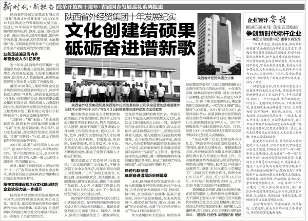 集團(tuán)公司分別于2018年5月10日、2018年5月15日在陜西日?qǐng)?bào)第5版以及華商報(bào)B02版登載了題為《改革創(chuàng)新外經(jīng)貿(mào)綜合平臺(tái) 鑄造陜西外向型企業(yè)品牌——陜西省外經(jīng)貿(mào)實(shí)業(yè)集團(tuán)有限公司開創(chuàng)外經(jīng)貿(mào)發(fā)展新局面》、《陜西省外經(jīng)貿(mào)集團(tuán)十年發(fā)展紀(jì)實(shí)文化創(chuàng)建結(jié)碩果砥礪奮進(jìn)譜新歌》的兩篇文章。